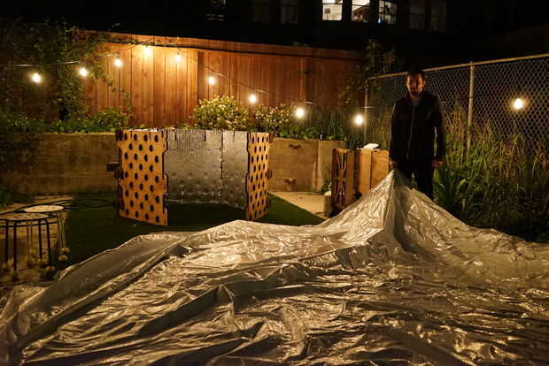 2. Saque el forro: Con el agua suficientemente bajo, quité las correas del trinquete y el panel que fue cuesta abajo. Tirando un poco, el agua empuja contra el extremo abierto y drena hacia fuera. La ligera pendiente del patio trasero de mi amigo no hizo esta agua realmente fácil-quedó para obtener en la forma de doblar el forro.