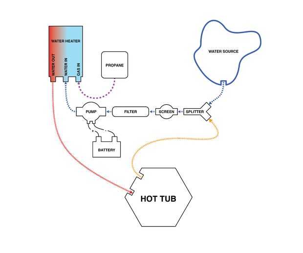 - La entrada de agua pasa a través de un divisor de 2 vías, así que cambia de la fuente de agua fría (lago, río, manguera, cualquiera que sea) y recircular el agua caliente de la tina.