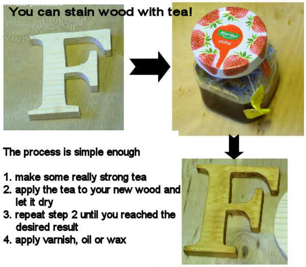 R: cuando usted teñir madera con té la madera obtiene un color amarillo natural que está muy cerca de la yelowness esa occures cuando edades de madera en interiores. Así por ejemplo, si la reparación de una pieza de mobiliario que se ha convertido en amarillo debido a la edad puede utilizar té para emparejar el color de la madera vieja en sus nuevas piezas y reparaciones.