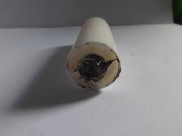 Cortar el fondo de la pieza central y el lugar en el agujero de la barra. Calentar la varilla de metal sobre el fuego hasta que esté lo suficientemente caliente como para derretir el plástico. Pero ten cuidado; el fuego es caliente. La parte superior de la pieza de centro del derretimiento y poner el plástico fundido alrededor del agujero en el palillo del pegamento, puede tomar un par de intentos. Usted puede probar cómo resistente al agua es colocando un pedazo de algodón en él y sumergiéndola en agua durante un par de segundos. Si el algodón se empapa puede que necesite el parche el agujero otra vez.