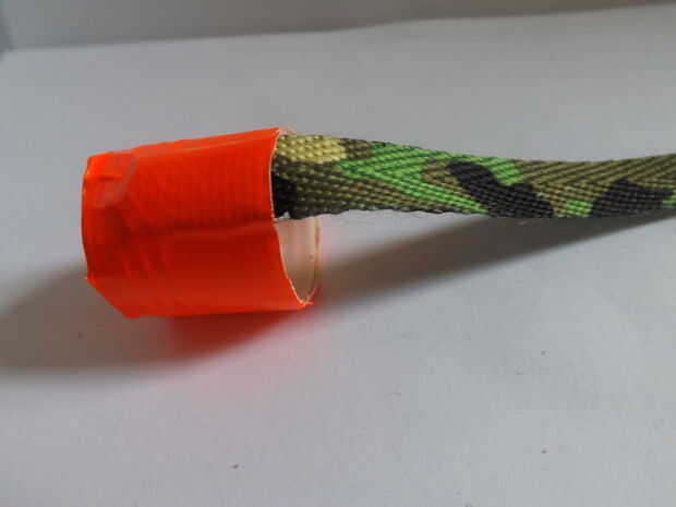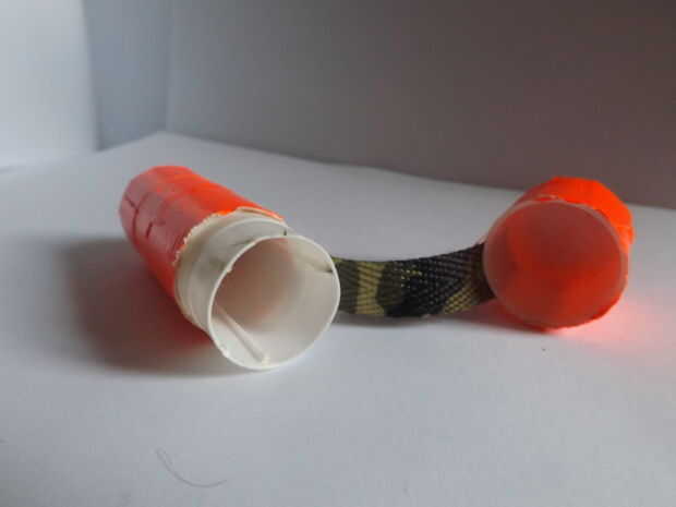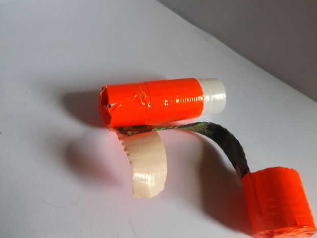 Cortar el cordaje de un pedazo de 2 pulgadas (5cm), asegurándose de que usted corte el extremo duro si se trata de un cordón. Ponga un extremo de las cuerdas sobre la tapa del palillo de pegamento y envuelva la cinta alrededor de ella para cubrir y asegurar el cordaje. Luego coloque el otro extremo en la parte inferior de la barra de pegamento y cinta alrededor como antes. Con cinta las piezas sigue mostrando y rellenar bien con algodón. Ahora debería estar listo para uso, llenado para arriba y se va! El cable de la tapa y la parte inferior de la barra es ideal para colocarlo en el cinturón o paquete y también hace que no pierda la tapa.