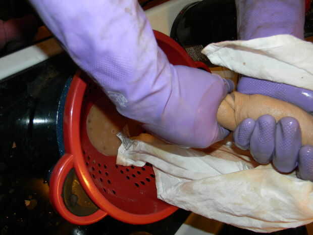 Ponte los guantes. Vacía los contenidos del jarro en el colador, forrado con varias capas de estopilla, por encima del recipiente no reactivo. Escurre las hojas de estopilla para sacarle todo el líquido. Desecha los sólidos.