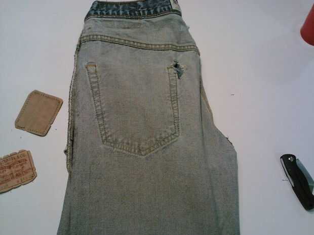 En este punto, quieres preparar tus jeans. Básicamente, si tienes etiquetas o elementos en los pantalones vaqueros que no teñido, debe eliminarlos.