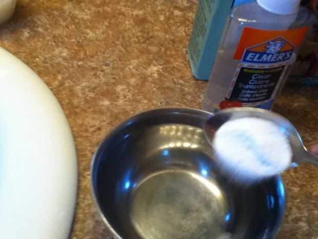 Mezclar 1 taza de agua con 1/2 cucharadita de bórax. Revolver hasta que se revierte. Que, añadir 2 gotas de colorante de azul, verde o rosa, que todo te gusta. JAJAJA