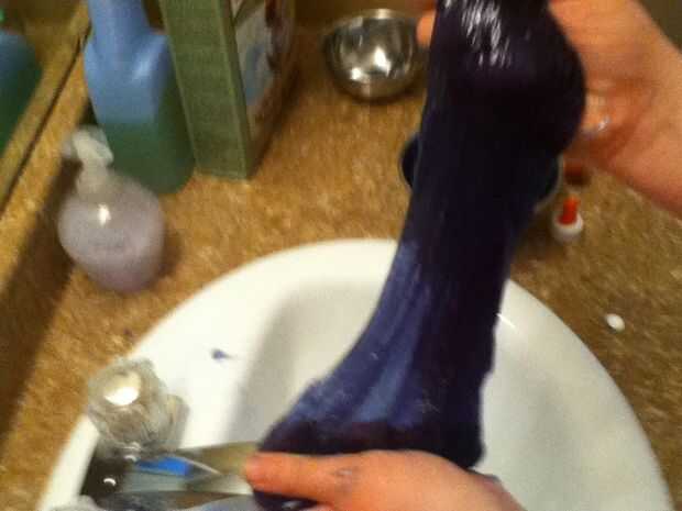 Ahora, toma ambos de sus soluciones y mezclarlas juntas (la solución de pegamento en la solución de bórax). Tire suavemente hacia arriba y abajo de la cola. Finalmente, el pegamento va a absorber toda el agua, pero habrá un poco de agua que puede lanzar hacia fuera. ¡ Disfrute! :) tihi