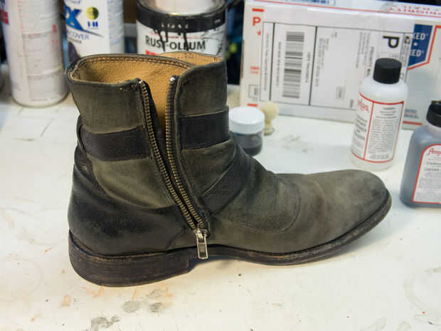 - De cuero preparador y deglazer. Estoy usando Angelus cuero preparador, que funciona bastante bien. También puede usar acetona o diversos productos Saphir. El propósito es quitar el acabado externo original de la zapatilla.