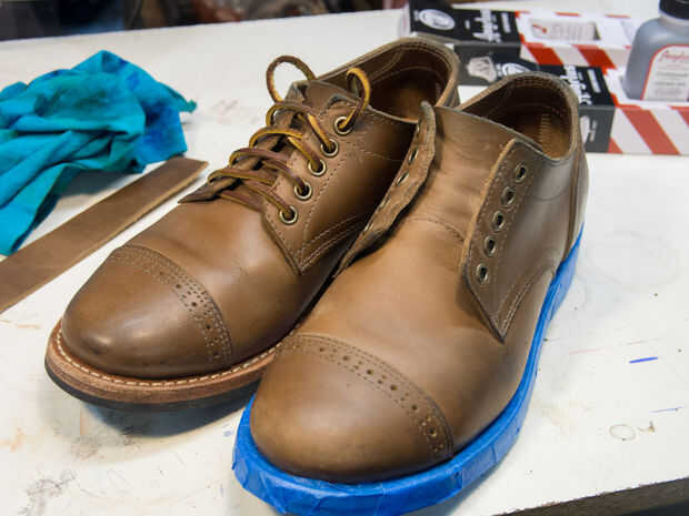 También se debe utilizar este tiempo para enmascarar las áreas que no quiere teñir. El tinte no puede ser tan removido una vez que toca algo, utilice una cinta adhesiva de buena calidad para zonas de bloque no desea teñidos. En este caso, quiero la suela y welt permanecer natural, por lo que he enmascarado les completamente.