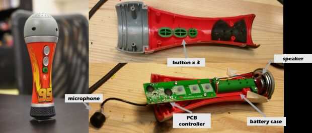 He comprado un juguete micrófono de Toysrus, que consiste en un micrófono, una tarjeta de circuitos, 3 botones y un altavoz. Originalmente, este juguete se utiliza para amplificar y alterar la voz del usuario. Sólo soltar el micrófono y volver a utilizar todas las otras partes. Con el fin de reutilizar las otras partes, primero desmontar la parte entera y desconecte todas las conexiones entre las partes. Puede hacer esto simplemente mediante un destornillador y una pinza. Por fin tenemos todas las piezas (3 botones, placa de circuito, un altavoz) separadas y con ganas de rehacer.