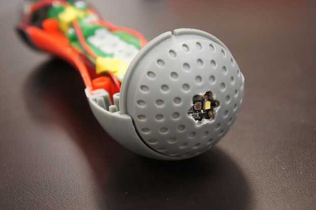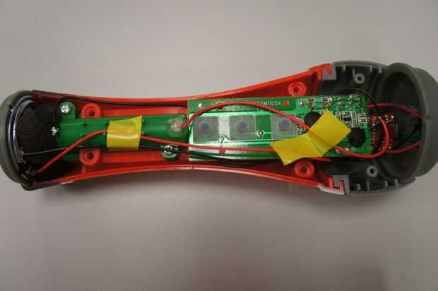 Ahora traemos a todas las partes eléctricas hacia el juguete. Como nuestra Arduino(Blend Micro) es muy pequeño, no tenemos que cambiar el diseño de la pieza o moverlos. Sólo podemos poner el Arduino en el espacio entre la platina y el caso. También tenemos que cortar un pequeño agujero en la punta del juguete para que el sensor de color recibe la suficiente luz reflejada de un objeto de destino.
