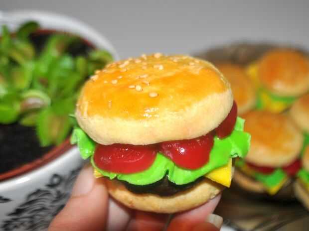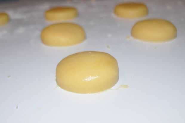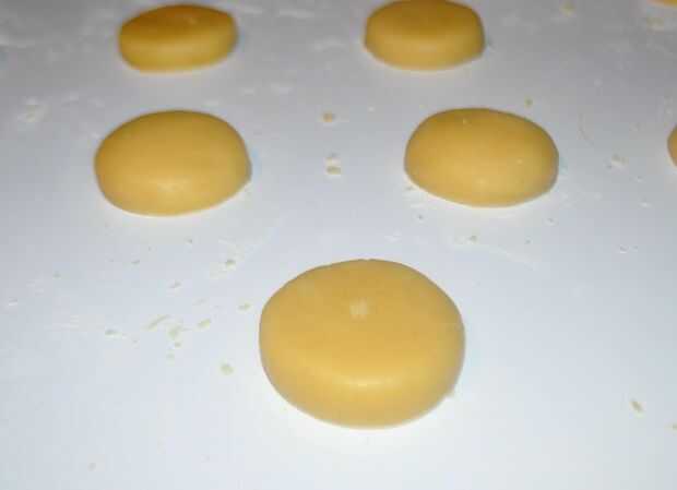 Estirar la masa de galletas (aproximadamente 1/2 pulgada de espesor). Use un cortador de galletas redondo o un vaso de agua boca abajo para recortar las galletas. Como se muestra en la imagen, aplana suavemente la parte inferior de la bollo de hamburguesa.