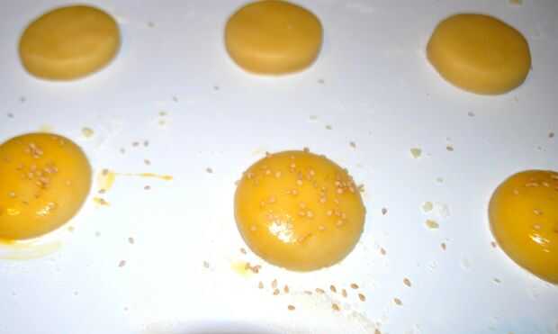 Cepillo de la yema de huevo sobre las galletas sin hornear y espolvorear con semillas de sésamo.