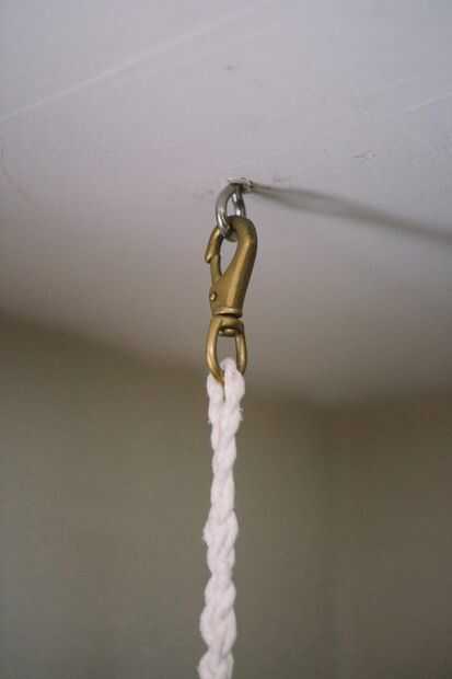 - Agregado una cuerda a la parte delantera de la plataforma y en el techo con un gancho de ojo en una viga de techo o un anclaje de paneles de yeso. También puede conectar el gancho del ojo en la pared que suites fantasía!