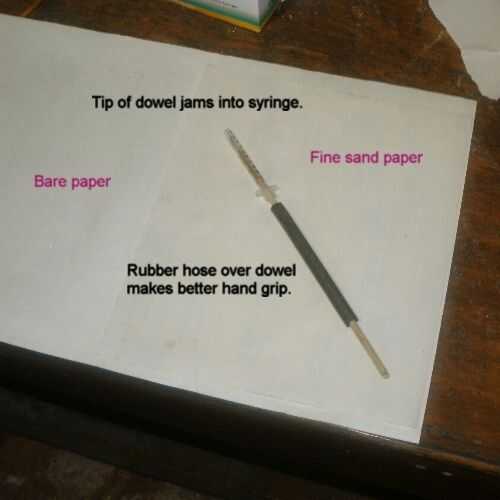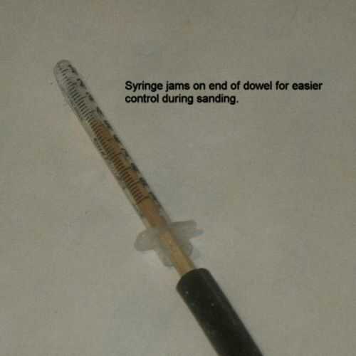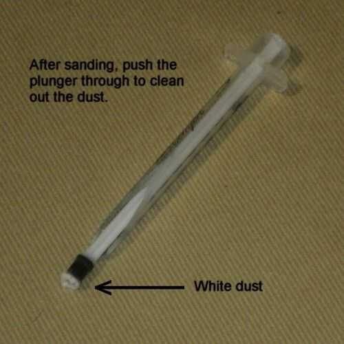 Después de lijar la curva, tienes que vestir las asperezas raspando o cortando con un cuchillo afilado. Yo uso un cuchillo puntiagudo de x-acto. Empuje el émbolo original a través de limpiar cualquier polvo dentro.