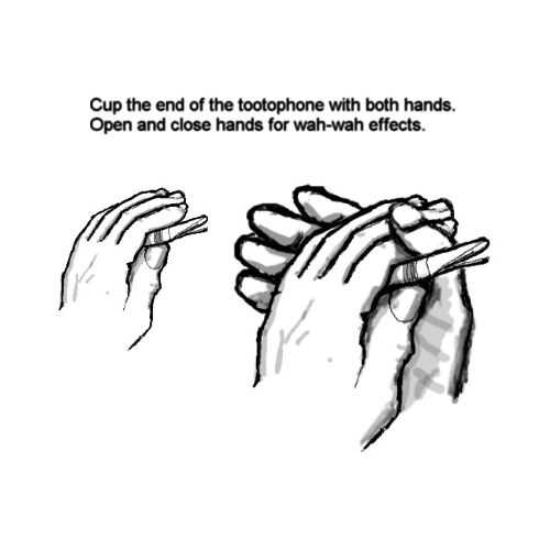 En cambio, la taza el extremo de la boquilla o el instrumento con las dos manos, que encierra una bola de aire. Abrir y cerrar sus manos para crear un efecto de wah-wah y afinar la nota básica creada por el control de la boca y la respiración. Cierre las manos crea más resistencia al flujo de aire y un tono más bajo, lo mismo que tener una mayor columna de aire en un cuerpo más de largo hace. Abrir las manos levanta el tono.