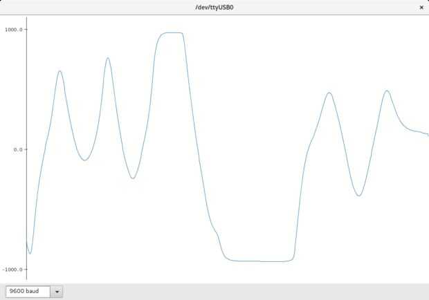 - Test2: usando la interfaz de serie, se pueden visualizar, utilizar el trazador del IDE de Arduino, el efecto de los sensores cuando pones en el obstáculo (las manos) delante de los sensores de lado. Éste visualiza la diferencia entre sensores izquierdos y derecho. Si la mano está más cerca el sensor izquierdo o derecho, la curva se mueve en consecuencia.