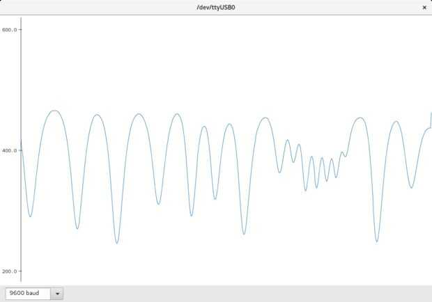 - Test1: usando la interfaz de serie, se pueden visualizar, usando el plotter del IDE de Arduino, el efecto del sensor cuando se pone en obstáculo (las manos) al sensor delantero.