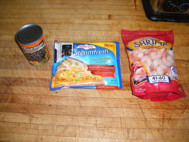 1) $2 ojo de los pájaros congelados arroz para ser más exactos. Es cocinados en el microondas y la bolsa de los soplos para arriba como una bolsa de palomitas de maíz, sin los estallidos. Este material es dulce. He usado estilo suroeste porque tiene maíz y zanahorias y tal.