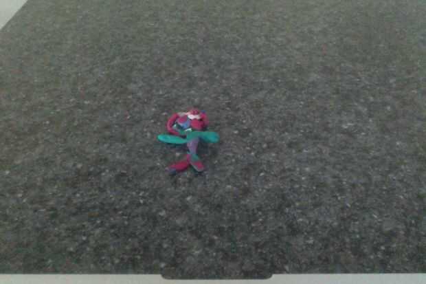 : paso 1 tome 3 diferentes colores de arcilla verde rojo wite hacer una cara con el verde entonces del esquema en rojo puso dos wite ojos en la cara y una boca de wite y hacer que el cuerpo así