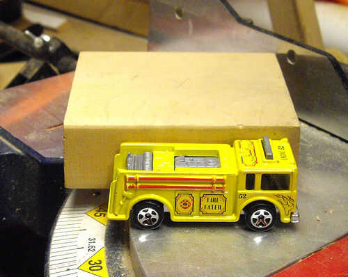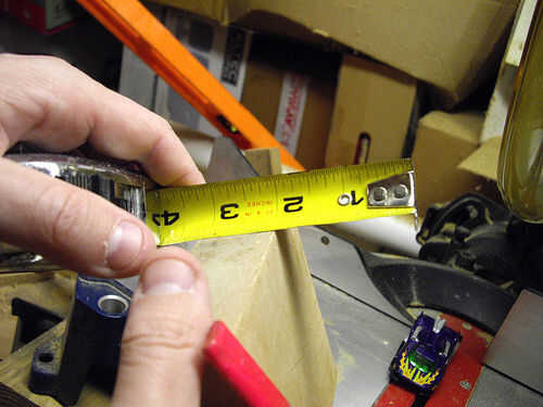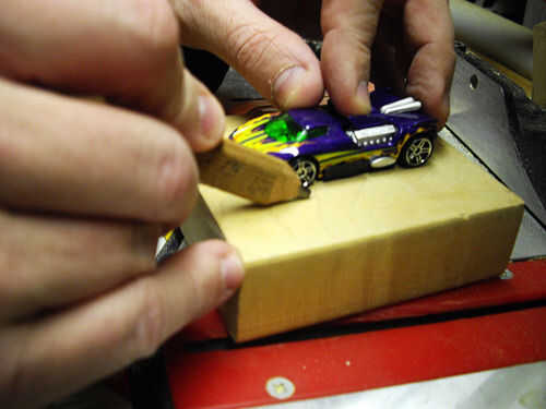 Después de marcar la anchura del coche, quitar el coche. Utilice un lápiz y una regla para dibujar líneas de referencia para el corte. Nuestro fueron alrededor de una pulgada en desde cualquier lado del bloque (ver fotos)