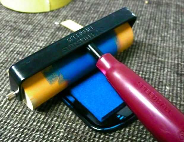 solía un brayer de almohadilla y speedball de sello de pigmento de la tinta del diseño. Usted conseguirá la caída de él después de varios intentos. Limpie cualquier tinta que va por mal camino.