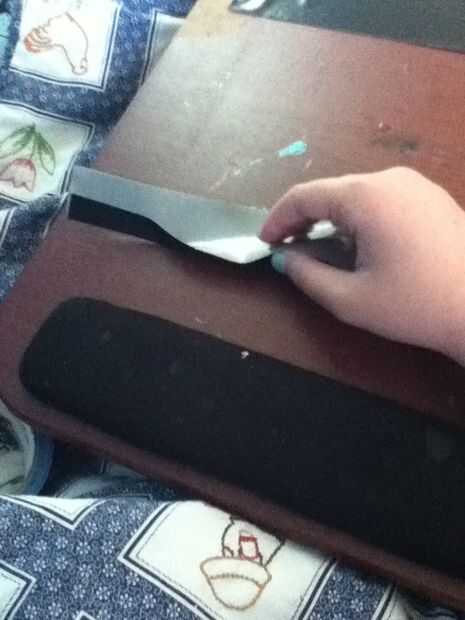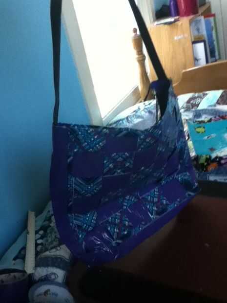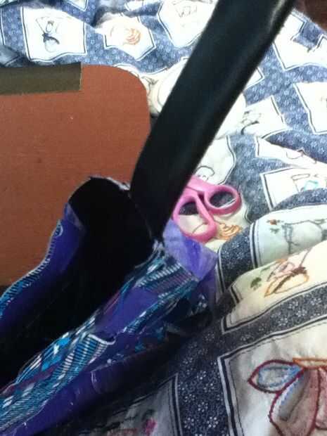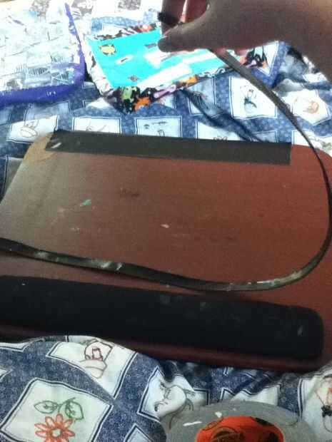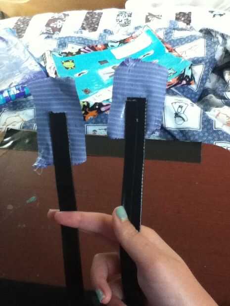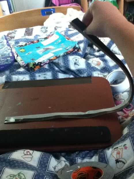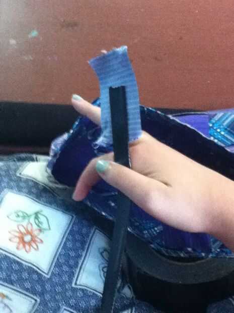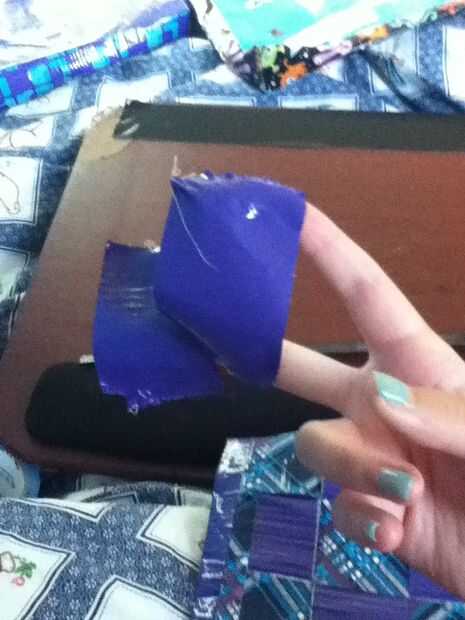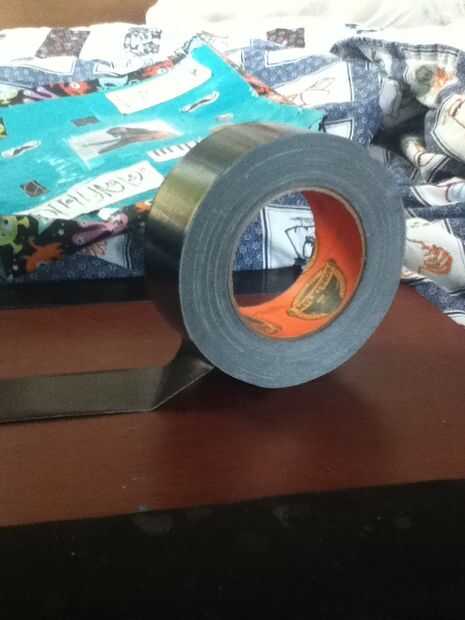 Select the color of duct tape that you want for te strap. Para medir, la cinta del conducto (en rollo) de Honda sobre su hombro y medir cuánto tiempo desea que su correa. A continuación, corte de la tira. A continuación, doblar la tira en tercios y cortó cualquier defectos. Finalmente, la cinta de te termina al interior de los lados de la bolsa. :)