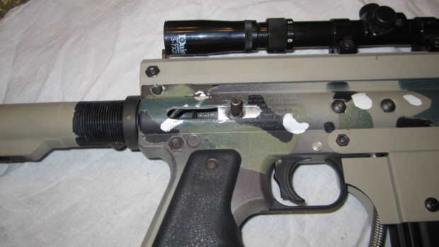6) volver a montar el marcador con la palanca de carga en el nuevo agujero. Archivo según sea necesario para asegurar una trayectoria suave de la palanca de carga.