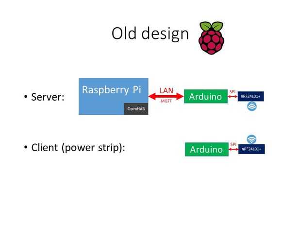Hay algún poder inteligente tira los diseños existentes basados en "Frambuesa Pi" y dos Arduinos, que se muestra en el cuadro "Diseño antiguo".