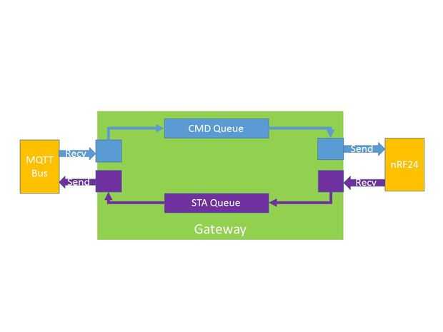 Por último, el programa de pasarela es el puente entre MQTT autobús y nRF24 el módulo y la arquitectura se muestra en la figura 2. Hay dos colas, cada una para una sola dirección (es decir, uno para el control de CMD de OpenHAB para la tira de la energía, uno para la dirección contraria). Básicamente es una implementación de lógica de simple productor/consumidor. El código fuente del portal puede encontrarse aquí, utiliza algunas 11 características C ++ (para instalar GCC nueva en Beaglebone Black, se refieren a este artículo) y asume la lib nRF24 está instalado (consulte el paso anterior).