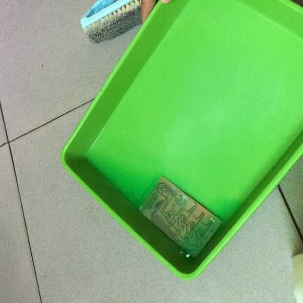 Usé ácido clorhídrico + peróxido de hidrógeno para grabar mi PCB. No voy a explicar este paso en detalle, pero usted puede comprobar este instructable (no la mía) si usted nunca grabe su propio PCB.