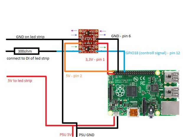 Ver en las fotos para detalles de cableado. Pero recuerde que debe mantener los cables de RasPi para tira de LED corto. Yo tenía unos 20cm y causaron leds parpadean.