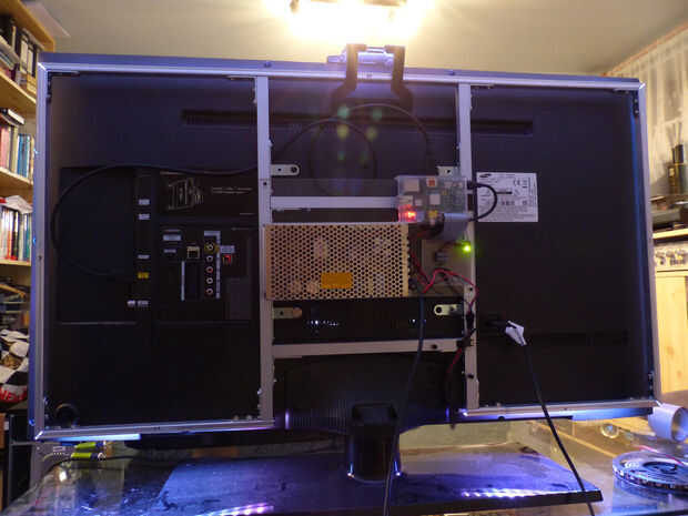 Calculé el marco por lo que esconde detrás de la tv y el LED doble en esas marcas de cuting en las esquinas. Marco entero se hace del aluminio, atornilladas y montado en los agujeros de tornillo para montaje en pared.