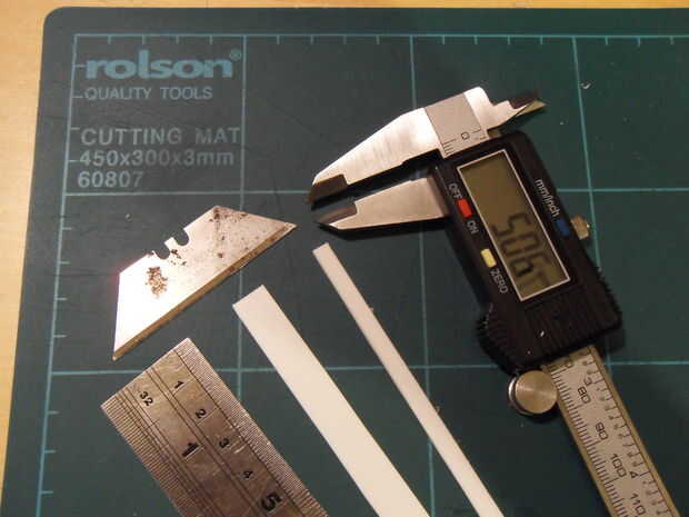 En primer lugar, cortar dos tiras de estireno, uno 5 mm de ancho y uno de 10 mm de ancho. Elegí estireno espesor 1,5 mm comprado en eBay.