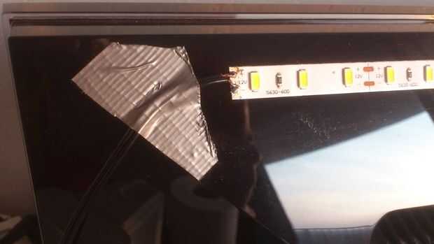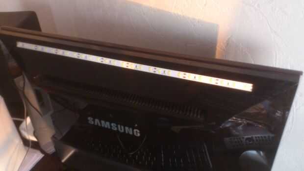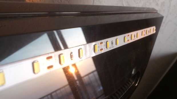 Si su monitor es mucho polvo, limpie primero para asegurar la buena fijación de la cinta adhesiva. Luego, una vez que has hecho que una vez más que la tira es de la longitud correcta, tomar del adhesivo tira de protección en la parte posterior de los LEDs y con cuidado poner el LED en el monitor.