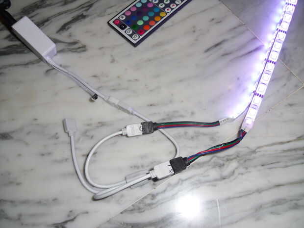 En lugar de utilizar el adaptador de corriente de 5A en muchos kits que están a la venta, he utilizado un adaptador de corriente de 6A. Si lees las especificaciones de la viruta llevada utilizada en mi tira de 5050 que verás que cada chip funciona con 0,24 vatios y 12 voltios. En una franja hay 300 leds. A continuación:
