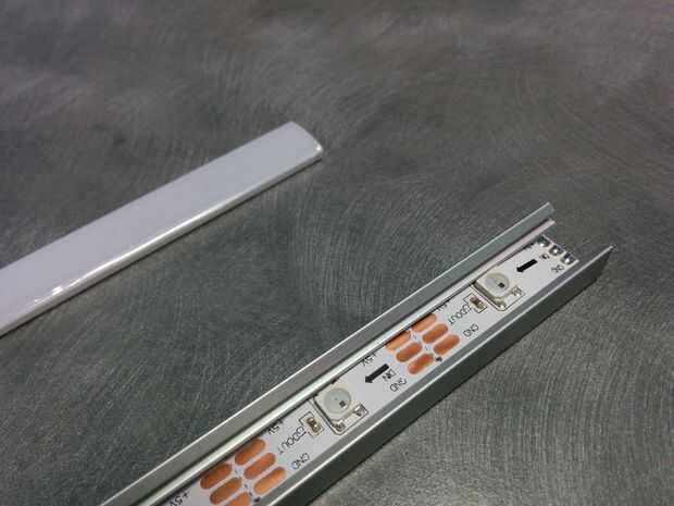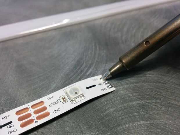 He comprado una tira de LEDs de RBG de Adafruit de Phenoptix. Vienen con una funda protectora de silicona para detener la humedad dañar ellos o cortocircuito los electrodos metálicos. Esto es genial pero les hace muy difícil de montar ya que descarta