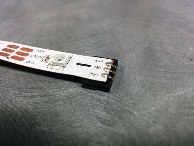Puede que necesite a las Naciones Unidas-curva les ligeramente para adaptarse a la franja entre ellos y el cuerpo de encabezado. Es importante intentar y centro de la franja dentro de la anchura de la cabecera pues esto ocasionará problemas en la extrusión de lo contrario. Para la tira de 3 pines, los conductores apenas pueden tocar los bordes de las almohadillas en la tira si se hace correctamente. Sin embargo, asegúrese de una buena soldadura conjunta, especialmente en las conexiones de corriente y tierra.