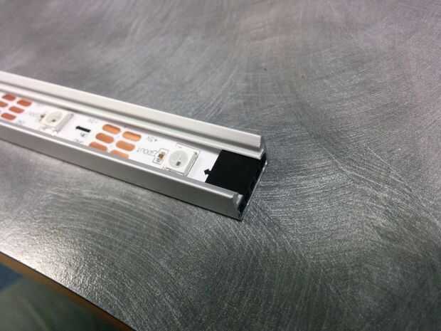 A continuación, el encabezado y la tira pueden ser deslizados en la extrusión. Se trata de un ajuste apretado, así que es mejor presentar el borde de la extrusión suave para no rasgar la cubierta de cinta cuando se insertan. Si esto sucede, será más difícil deslizar la tira sobre el resto de la construcción.