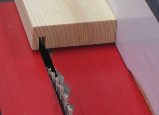 Una vez que la profundidad de la cuchilla, establecer la guía para que el borde del tablero era de unos 3mm más allá del borde de la hoja y corte una ranura.  Entonces mudamos la valla un poco y cortar otro surco, repitiendo hasta que la ranura parecía lo suficientemente grande como para alojar los LEDs (aproximadamente 3/8 de pulgada).  Entonces me moví un poco más lejos sobre y trajo la hoja arriba bastante para cortar completamente a través de la Junta y cortarlo.