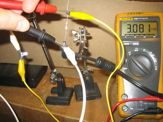 Idealmente, tendría hojas de especificaciones de los LED que indique el voltaje apropiado y la corriente, pero nuevamente estoy utilizando algunos que fueron tirados fuera de otro proyecto, para no tener práctico. Mirando las especificaciones para un producto similar (http://www.superbrightleds.com/moreinfo/component-leds/5mm-white-led-30-degree-viewing-angle-18000-mcd/256/), la calificación actual es de 30 mA con un pico de 70mA, y la caída de tensión es de alrededor de 3.4. Mi multímetro realmente tiene una configuración de diodo, pero no mide la caída de tensión en estos. Para comprobar, que enciende un LED para ver cuánto voltaje caía a través de él; fue sólo de 3v.