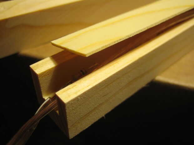 Haber comprobado que funciona, era el momento de desconectar y terminar poniendo juntos. Apreto los LEDs firmemente en sus orificios, y cerrada la parte trasera pegando en la tira delgada de madera que corté anterior en la tabla VI. De lo contrario, cinta o algún otro aislador trabajaría para cubrir la espalda y los extremos.
