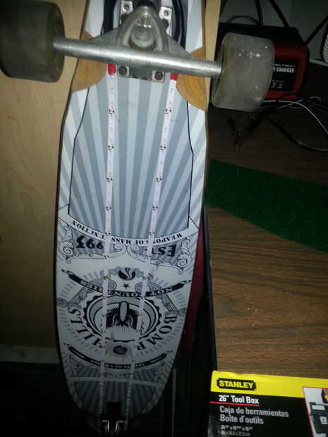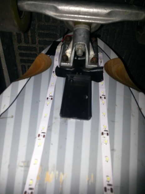 utilicé cinta adhesiva de doble cara para sujetar la batería de 9 voltios hacia atrás, después que la soldadura el el cable rojo que sale al positivo de la tira de LED. Luego hice lo mismo con el alambre negitive. Hay un interruptor para encender y apagar las tiras de LED de la batería. Usted también puede utilizar el pegamento. Cubrí el alambre que va alrededor de los camiones con cinta aislante.