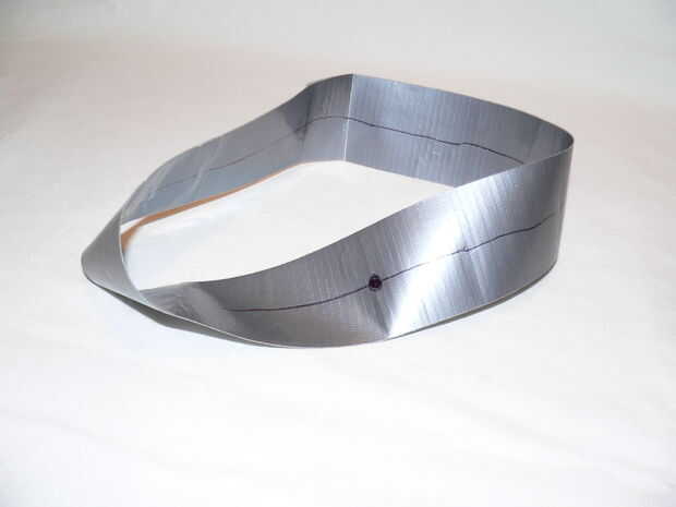 Ahora, corte en esa línea todo el camino alrededor. En vez de dos tiras más delgadas de Mobius como usted puede esperar, terminarás con una tira de Mobius dos veces tan larga como el primero!