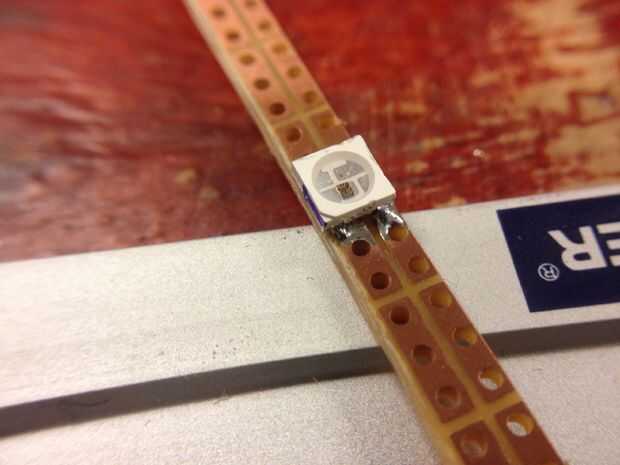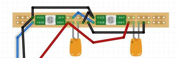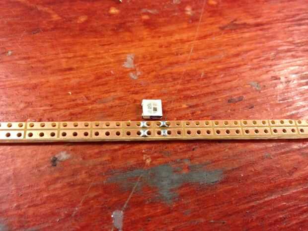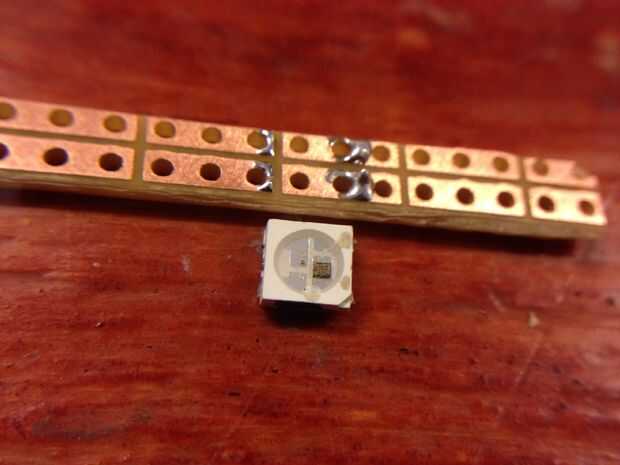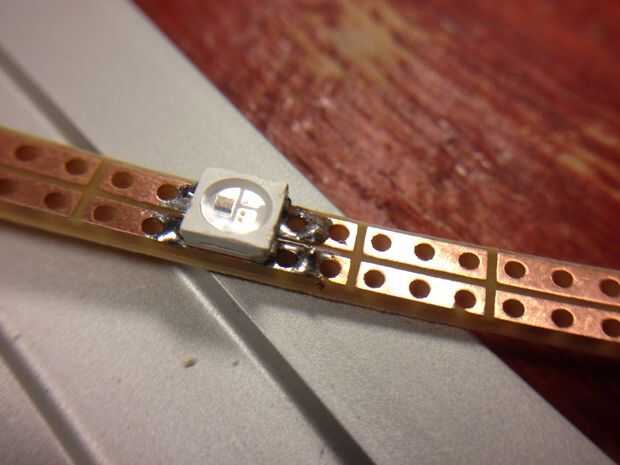 Es más fácil conectar las fichas de izquierda a derecha si están boca abajo en comparación con la hoja de datos, como datos de salida (DO) y es a la derecha del chip y puede conectar con el siguiente chip más lejos a la derecha datos en (DI) en el lado izquierdo. Fritzing dibujo de la ws2812b en el modo tablero está invertida, por lo le da alguna pista a lo que es más fácil. Como debemos conectar todo con hilos más adelante, deje espacio para ésos en la soldadura. Los agujeros en el perfboard son suficientemente amplio como para llevar dos cables a la vez si es necesario.