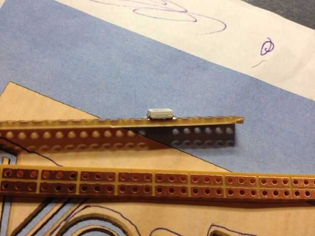 En la preparación de la tira de perfboard, uso el soldador para aplicar soldadura a los 4 puntos que usted desea montar el chip. Esto ayuda a la conductividad de calor y permitir que la soldadura fluya por debajo de la viruta mientras que cuidadosamente calor los pernos chip´s de lado. Tener cuidado de buscar la marca de la muesca triangular en la esquina del chip. Esto indica la orientación de chip´s!