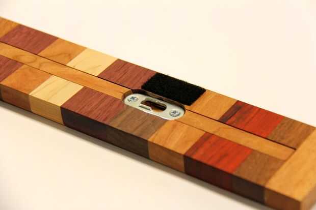 Los ganchos de ojo de la cerradura empuje la tira de la pared tan ligeramente y al colocar o retirar un cuchillo de la tira, la tira hizo shimmy un poco. Usé el lado suave de una tira de velcro adhesiva como un cojín de espesor para ocupar el espacio entre la tira y la lana - trabajado como un encanto.