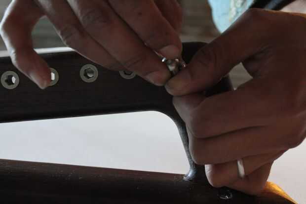 Empiezan con rollo número 1 que consigue el soporte superior izquierdo. Usted puede dejar la tira rodada hasta que todos los rodillos están instalados en el soporte superior. Esto les ayuda de conseguir enredado. Coloque la tira en el inserto de latón utilizando uno de los tornillos de máquina. Sólo tiene que colocar los tornillos a mano por ahora, más adelante usted puede apretar con la broca de destornillador y hexagonal.