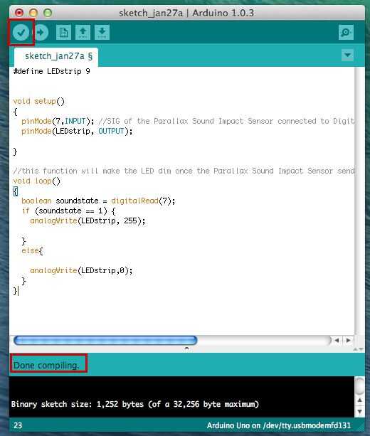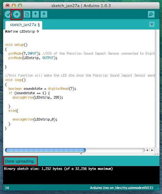 Pulse el icono de carga (parece una flecha hacia derecha) y debe subir en unos 10 segundos. Debería ver un pormpt "Done Uploading." en la parte inferior de la ventana cuando esta es completa.