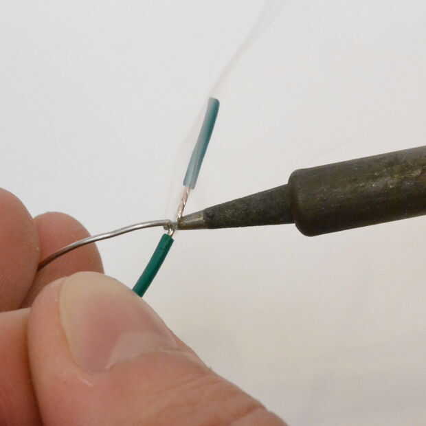 Sujete el hilo entre el pulgar y primer dedo y la soldadura entre los dedos segundo y terceros. NO hay necesidad para una tercera mano derecha ahora, los dedos segundo y terceros tienen abundancia suficiente destreza para alimentar la soldadura sobre el cable de calefacción. Pruébalo, te ayudarán a y otra vez si aprenden este truco.