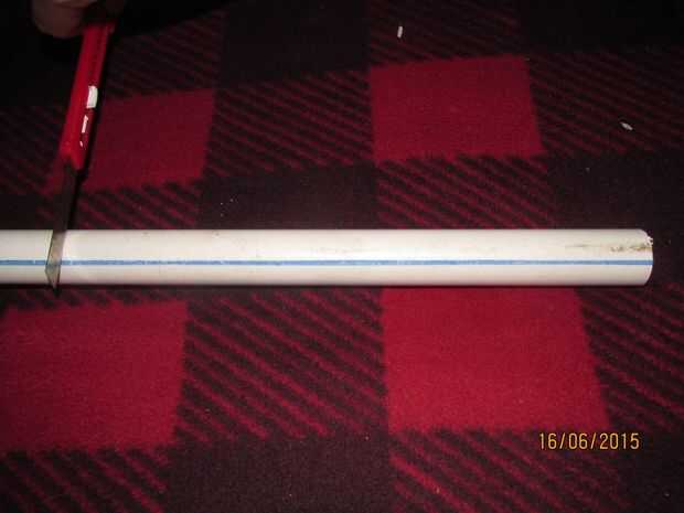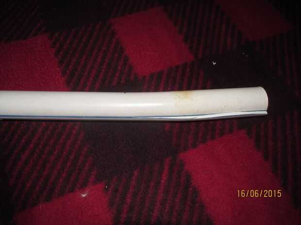 Haga una marca apenas más ancha que su mano por el mango. Use una heatgun o estufa para ablandar la tubería en el otro lado de la marca, luego se corta completamente por la mitad a la marca.