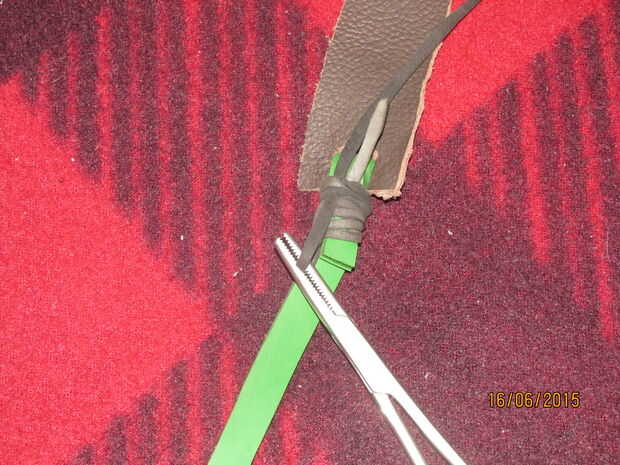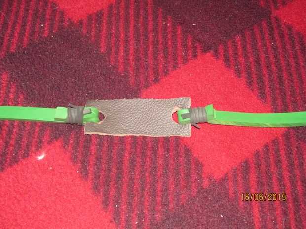 Colocar las pinzas como se muestra, abrigo la goma dos veces alrededor de la pinza y en el tercero, utilice las pinzas para tirar la goma a través. Ahora corta los extremos sueltos y repita con la otra banda.